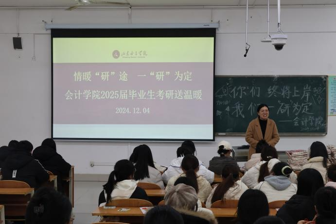 为帮助会计学子坚定考研信心,鼓舞考研士气,缓解备考压力,12月4日下午,会计学院于博文楼105开展“情暖‘研’途 一‘研’为定”--2025届考研学子送温暖活动,为梦想“研”途增添一抹暖情亮色。学院党委副书记尹衍梅、毕业班辅导员和2025届考研学子参加。
