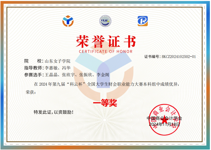 2024年11月10日,第九届“科云杯”全国大学生财会职业能力大赛本科组网络选拔赛在线上成功举办。本次大赛由中国商业会计学会主办,厦门科云信息科技有限公司承办,吸引了来自全国548所本科院校的1045支队伍参赛。经过激烈角逐,我院由李金阁、张振欣、张欣宇、王晶晶四位同学组成的参赛队伍凭借扎实的专业知识、出色的实务操作能力和团队协作精神,荣获一等奖,展现了我院学子在财会职业能力领域的卓越风采!