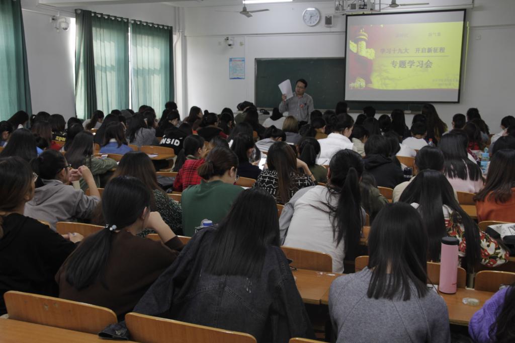 会上,总支负责人紧紧围绕习近平新时代中国特色社会主义思想这个主线,运用生动鲜明的例子和轻松诙谐的语言,就党的十九大的鲜明主题、习近平新时代中国特色社会主义思想的丰富内涵、党的十八大以来党和国家事业发生的历史性变革、中国特色社会主义进入新时代的重大意义、我国社会主要矛盾变化、“两个一百年”奋斗目标、坚定不移全面从严治党的重大部署等新提法和新举措进行了深度讲解。并号召全体学生加强对党史党情的学习,深刻了解我们国家、我们党“不忘初心,牢记使命”,为实现中国民族伟大复兴的艰苦历程。希望大家深入学习,广泛宣传,准确掌握十九大精神的深刻内涵和精神实质,做好学生中的引领员,宣传员,服务员,努力把十九大精神贯彻到院校建设和发展的全过程。