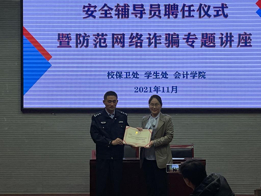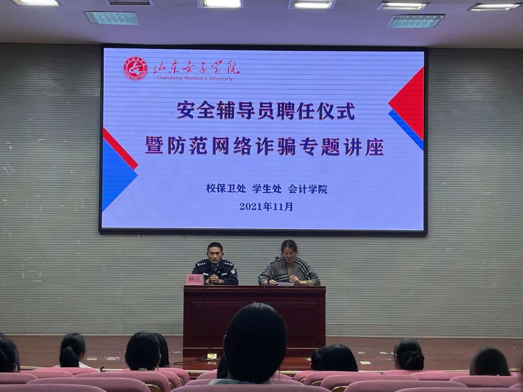 为切实强化山东女子学院会计学院师生反诈防骗意识,减少校园及网络诈骗案件的发生,提高学院师生安全防护意识和能力,2021年11月4日下午,会计学院安全辅导员聘任仪式暨防网络诈骗专题讲座在图书馆一楼报告厅顺利举行。保卫处处长武凯、会计学院党委书记赵丽丽,以及会计学院师生代表150余人参加了此次活动。聘任仪式由会计学院党委副书记包雪利主持。