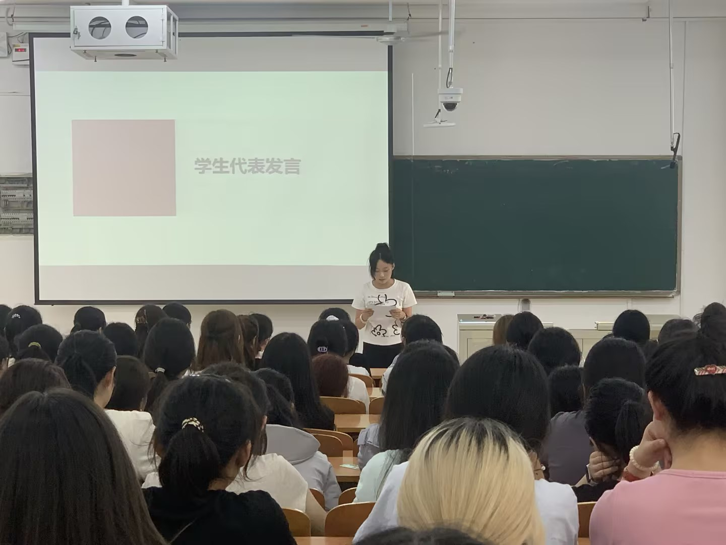 接着,新生辅导员发言。新生辅导员赵文文强调了入学教育的重要性,鼓励新生能够珍惜大学时光,积极参与各项活动,努力提升自身综合素质。她还向新生介绍了学院的规章制度、学生管理模式以及丰富多彩的校园文化活动。她表示大学四年将始终陪伴在学生身边,为大家提供关爱和帮助,努力做好学生的人生导师和知心朋友。