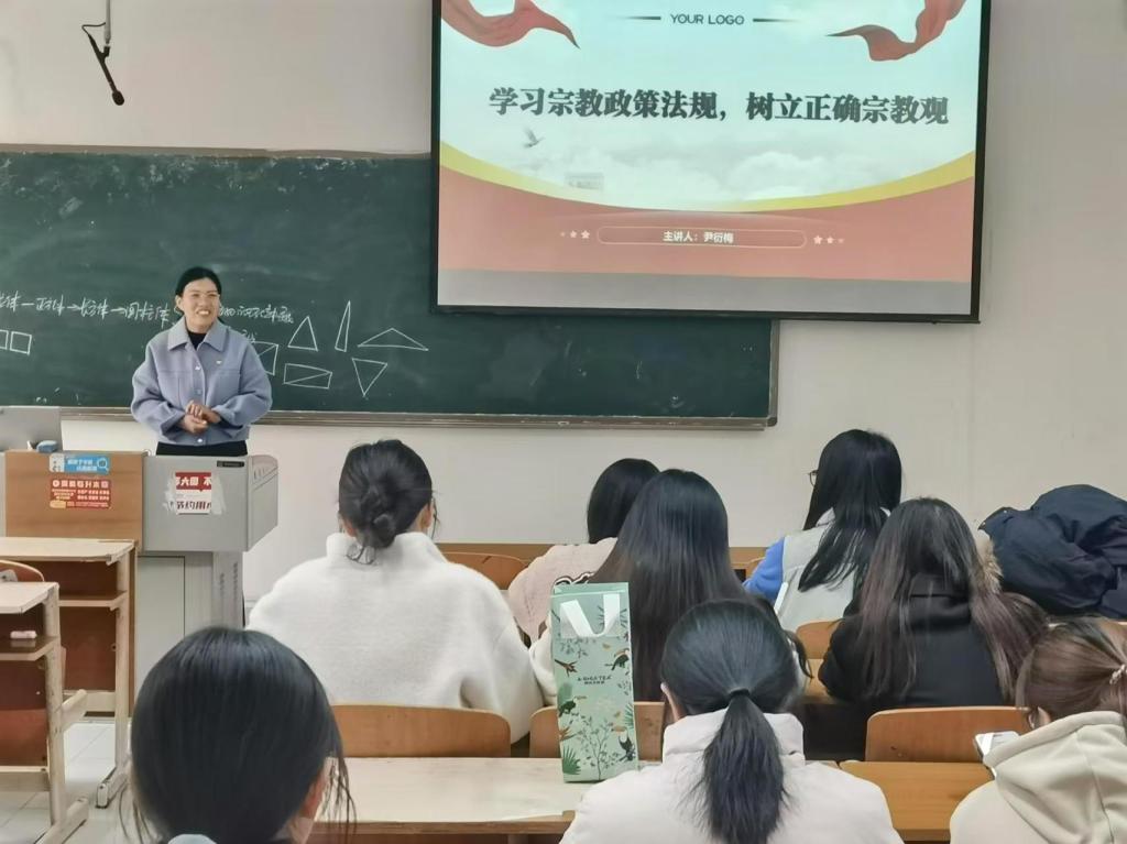 尹书记以“学习宗教政策法规,树立正确宗教观”为题,结合自身学习思考和工作实践,讲述了什么是宗教、宗教与封建迷信、邪教组织的区别、党的宗教工作基本方针,旗帜鲜明地指出我们国家实行教育与宗教相分离,任何组织和个人不得在学校进行宗教活动。她结合实际案例让大学生对党的宗教工作政策有了更清晰、更深刻地认识。最后她强调大学生应保持高度政治警惕性,自觉树立社会主义核心价值观,学习先进文化知识,用马克思主义思想武装头脑,树立正确的宗教观,自觉抵御非法宗教渗透;学生党员、学生干部要主动发挥榜样引领作用,积极发挥作用,共同营造积极、和谐、健康的校园文化氛围;要将自己所学报效祖国、服务社会,为实现中华民族伟大复兴贡献自己的力量。